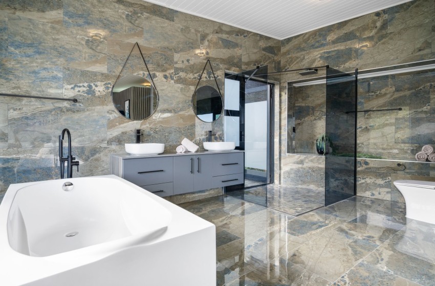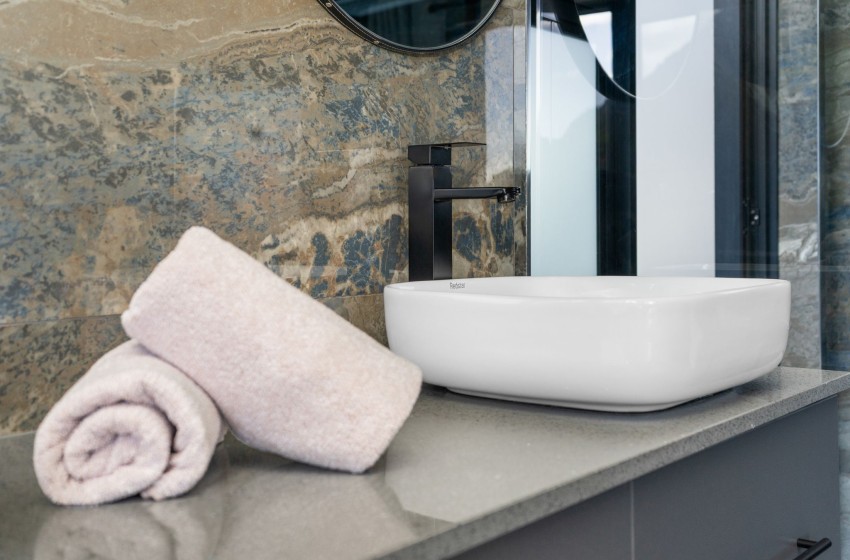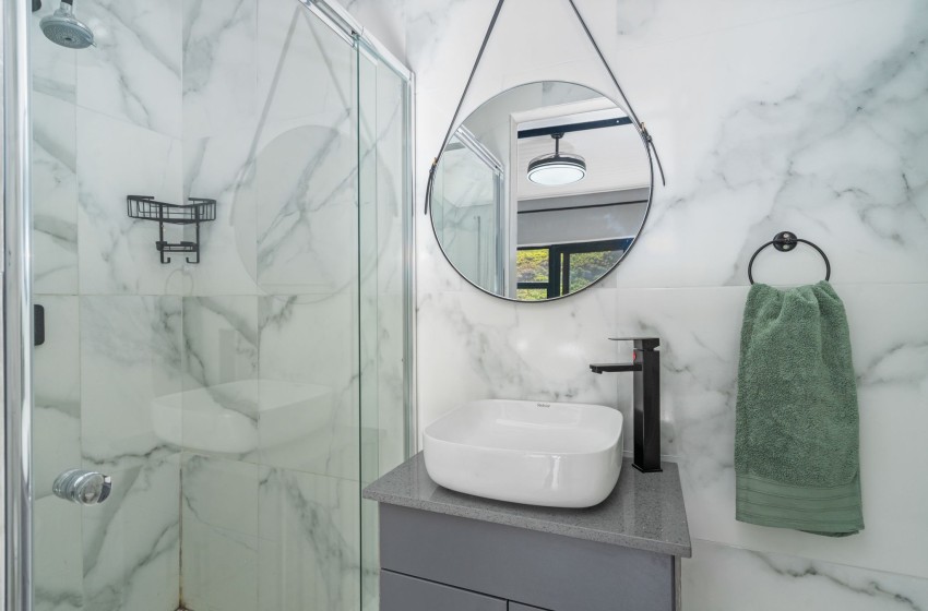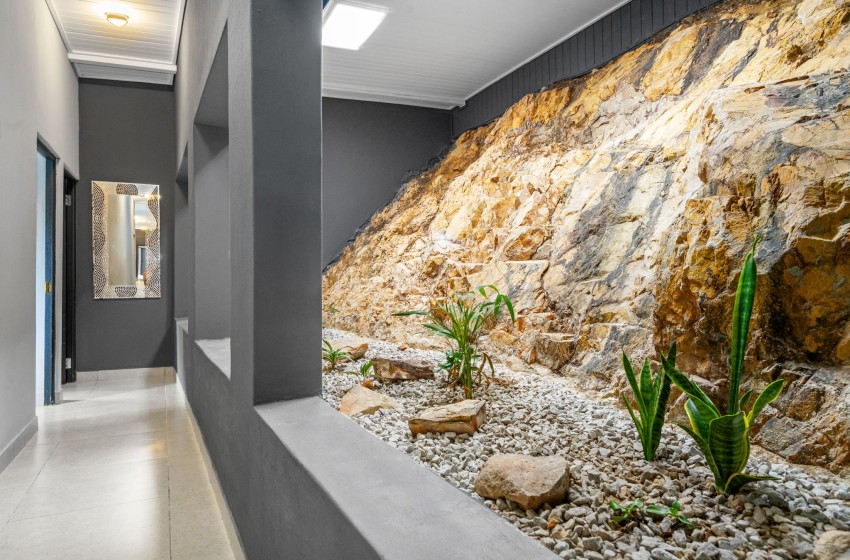 Leading you to the bedrooms is a hallway creating a peaceful ambience with a beautiful rock wall, pebbles and plants feature. bedrooms include a king bed in the first bedroom, a double bed in the second, and two single beds in the third bedroom. All three bedrooms have en-suit bathrooms for added privacy, all including a shower, toilet, basin with vanity and a bath featured in the main bedroom en-suite. Linen and towels are provided with your stay.