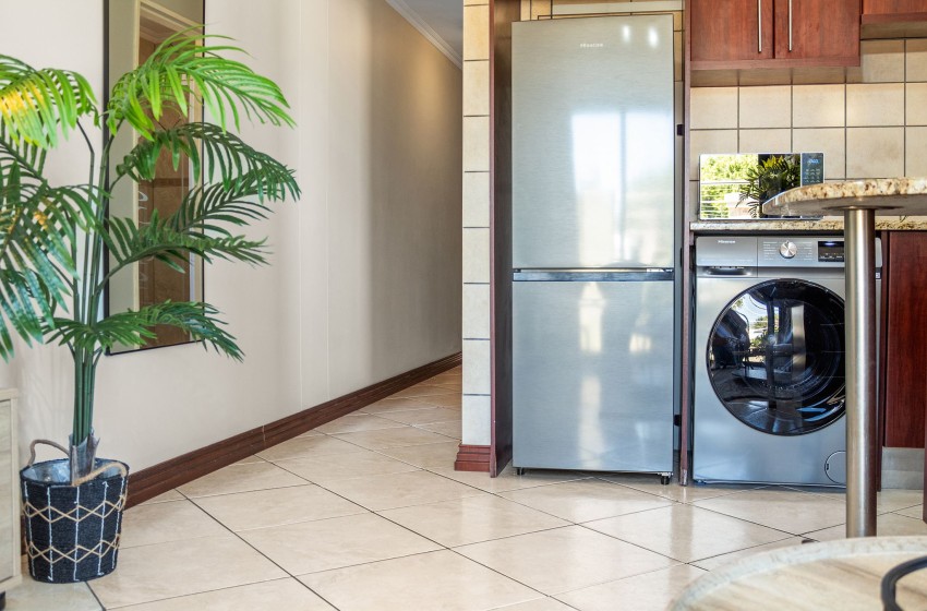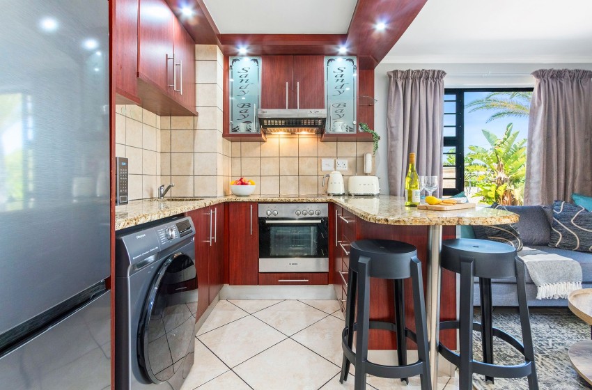 Upon entering the apartment, you will be greeted by the spacious open-plan design of the space with an abundance of natural light streaming in from the patio and large windows. The kitchen is fully equipped with everything you will need to enjoy a comfortable self-catering experience, including a front-loading washing machine for added convenience.