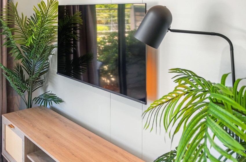Adjacent to the kitchen, the lounge features a comfy L-shaped couch, a stylish coffee table, and a TV cabinet housing a mounted flatscreen television equipped with access to streaming channels such as Netflix. Guests will enjoy Wi-Fi access throughout the property. Sliding doors open to the patio with an outdoor garden set with seating for two.