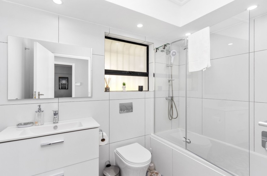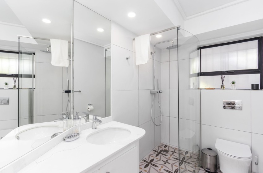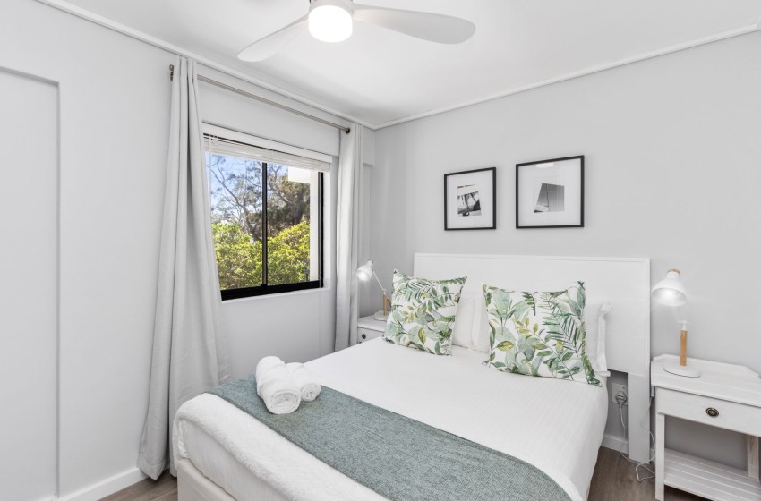Sausalito 201 boasts two elegantly decorated bedrooms, each designed with comfort and style in mind. The first bedroom features a luxurious queen bed, while the second bedroom offers a cosy double bed. The apartment includes two bathrooms; the master bedroom’s ensuite comes with a sleek shower and toilet, while the shared bathroom provides a shower/bath combo and toilet, all with modern glass finishes that add a touch of sophistication.