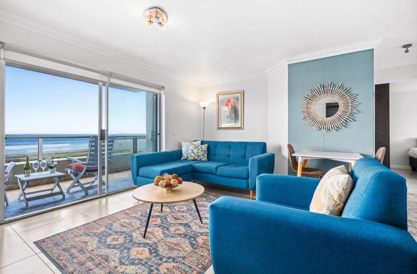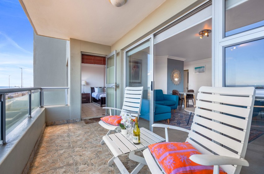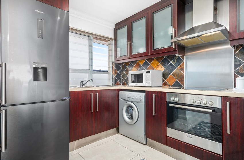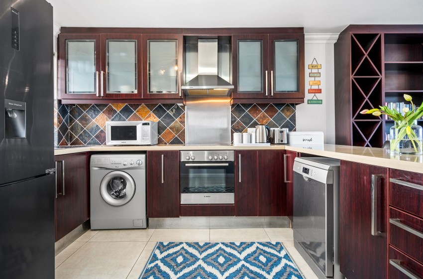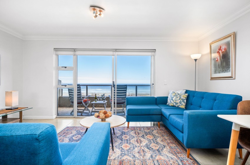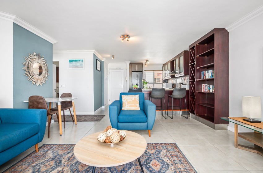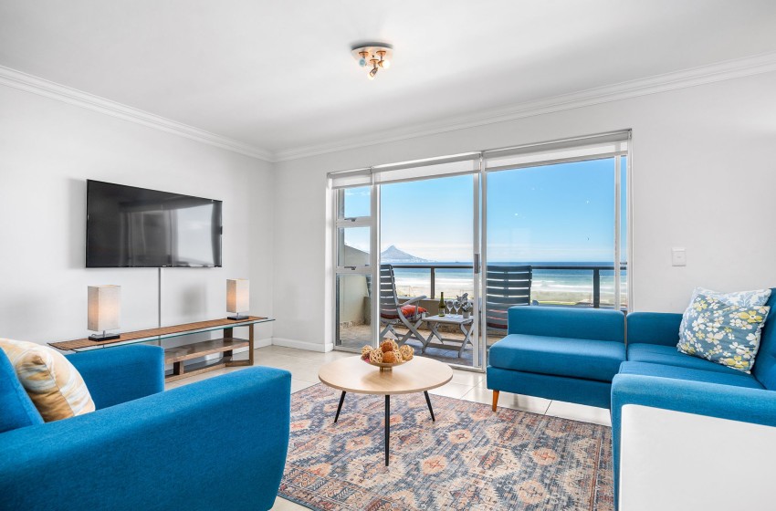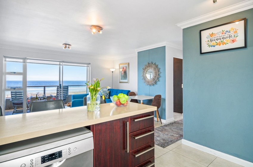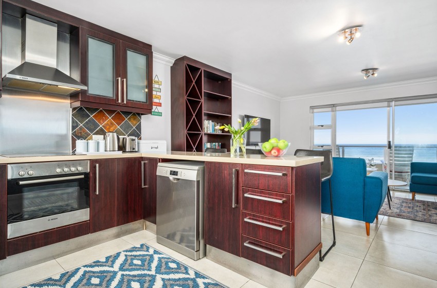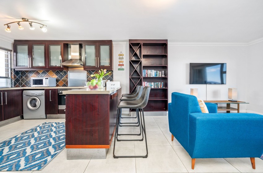 Entering the apartment, guests are welcomed into a modern, spacious kitchen. The kitchen is fully equipped with all amenities necessary for a comfortable self-catering stay, including a dishwasher and washing machine for added convenience. Walking past the kitchen, you will find a bright and airy lounge. The lounge features a flatscreen TV, plush couches, and a coffee table. Internet access is available throughout the apartment. Just off the lounge, you will find a dining table for two, perfect for a cosy, intimate dining experience. Guests can admire the spectacular views of the beachfront and Table Mountain from either the comfort of the lounge or outside on the balcony.