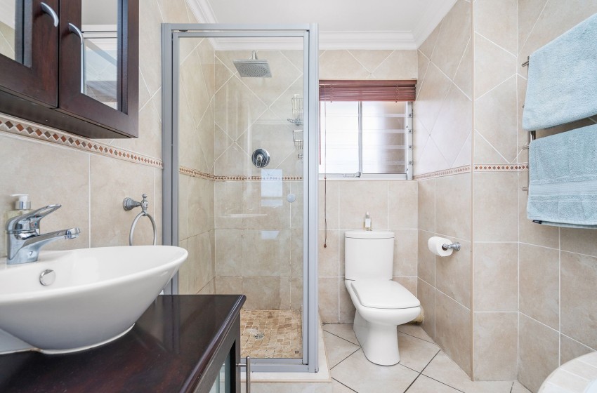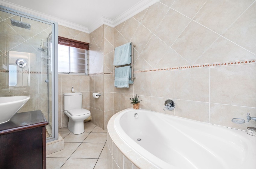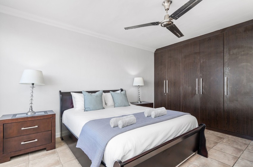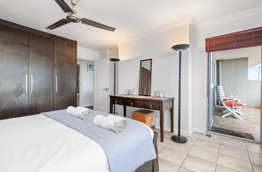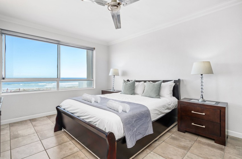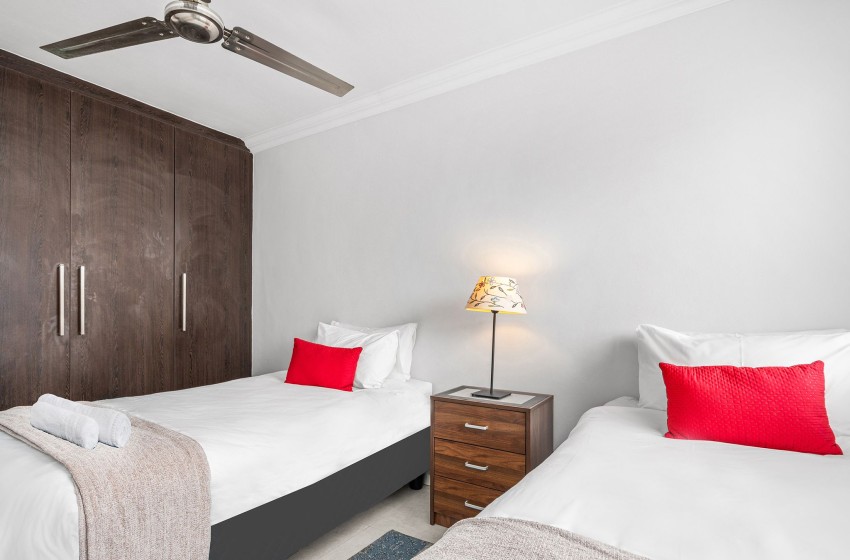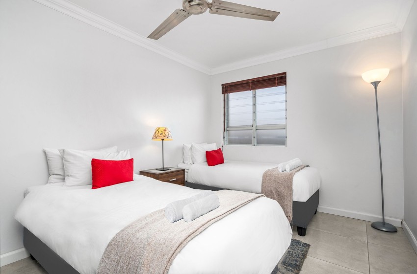 The main bedroom is spacious and contains a queen-size bed. The room features a large wardrobe with ample storage space as well as a window offering beautiful ocean views. The second bedroom includes two single beds sharing a nightstand. This room also features a sizeable wardrobe and a window overlooking the beachfront. The bathroom is fully tiled and contains a bath, shower, washbasin, and toilet. Linen and towels are provided for your stay.