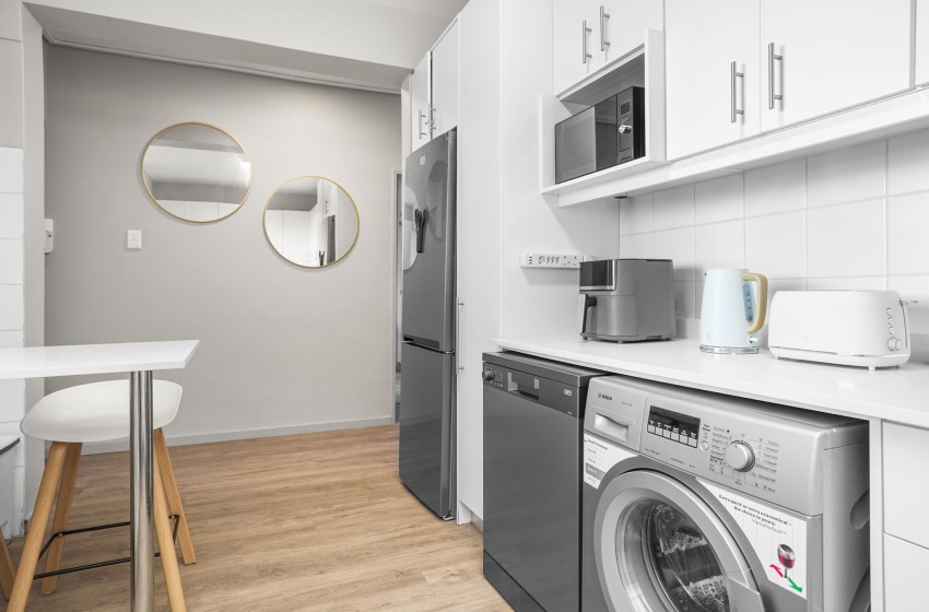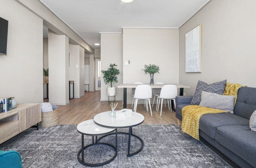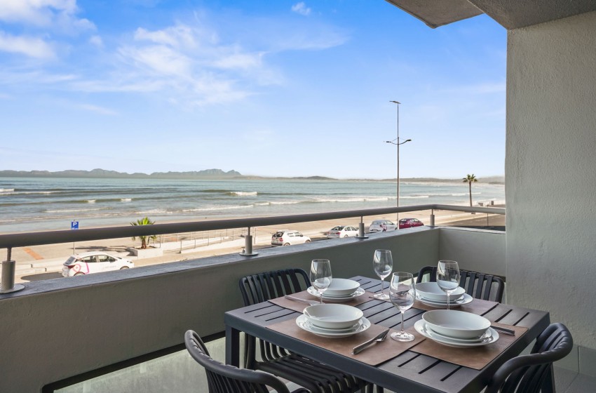In the seaside resort town of Strand in the Western Cape, you will find this chic two-bedroom apartment that comfortably accommodates up to four guests. Upon entering, you will be greeted by the sleek and modern design of the apartment, bathed in natural light, offering a sophisticated urban living experience.