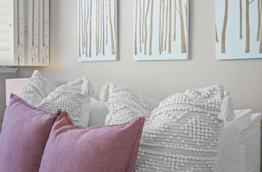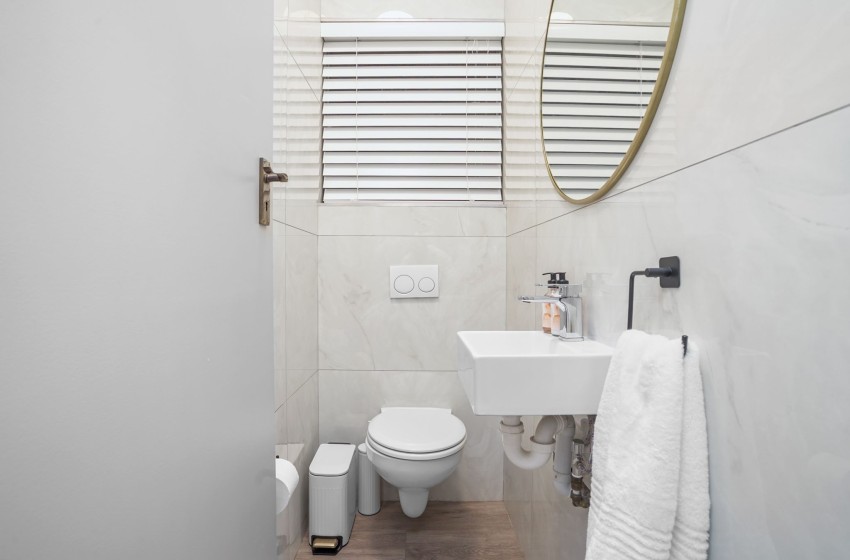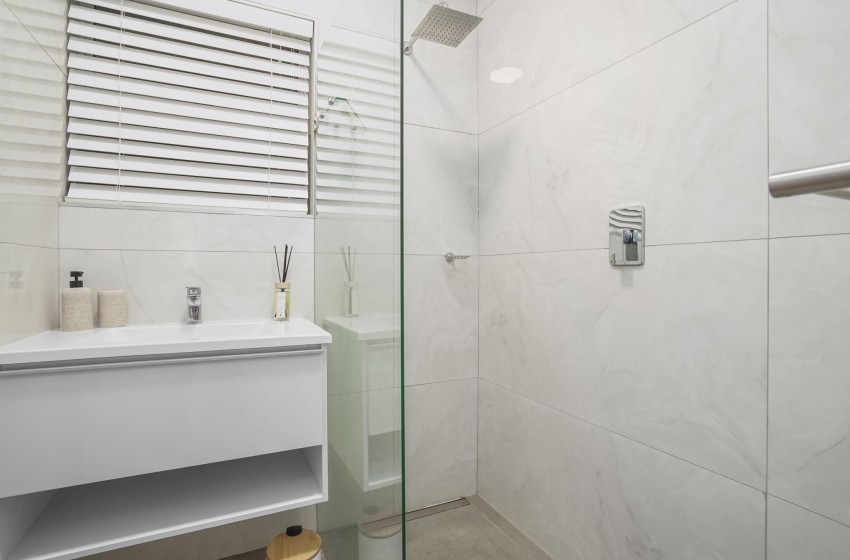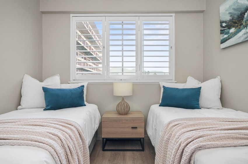 The apartment has two bedrooms. The spacious main bedroom is furnished with a comfortable queen bed with nightstands on either side. It offers ample storage space for your wardrobe and features a stylish couch at the foot of the bed, while the second bedroom is fitted with two single beds and a nightstand. The bathroom features a spacious walk-in shower, a basin with a bathroom cabinet, with a separate toilet fitted with a washbasin and vanity.