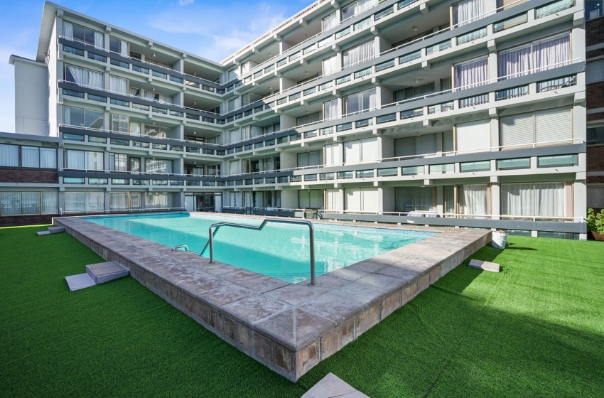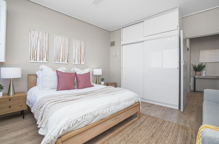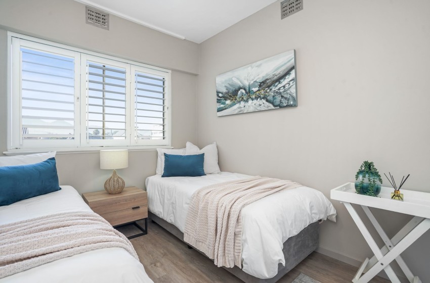Glass sliding doors lead to the spacious balcony boasting breathtaking ocean views, with beautiful sunsets over Table Mountain. This outdoor space is furnished with a charming dining set, making it an ideal setting for enjoying leisurely meals or sipping drinks while basking in the sunset. Guests will have access to secure parking, a shared outdoor pool, and a communal braai area.
