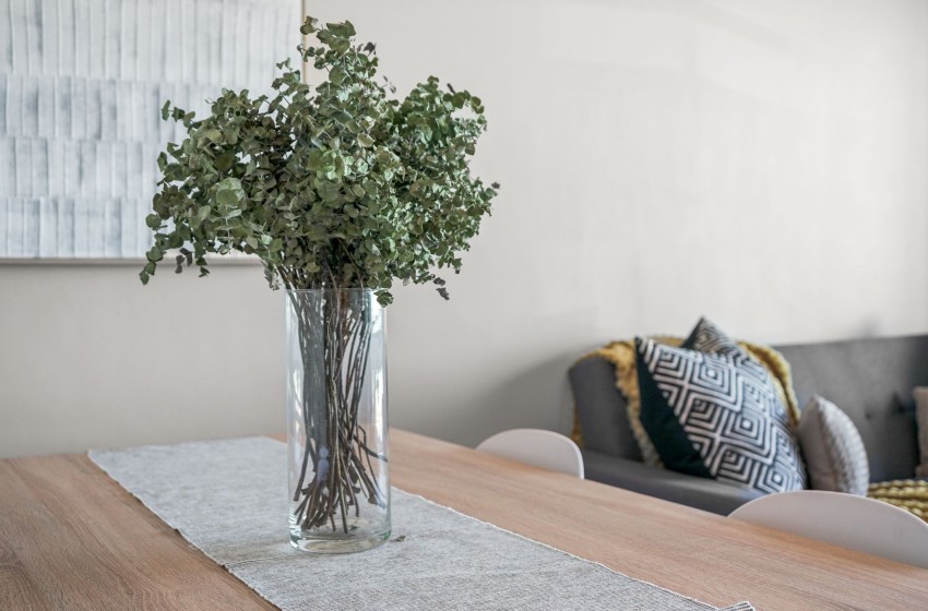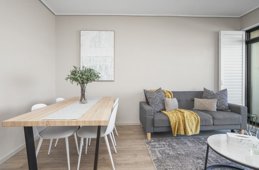 Adjacent to the dining area, the thoughtfully designed lounge invites relaxation, featuring a plush sofa paired with a single armchair. A sleek coffee table sits at the centre, creating a perfect spot for refreshments or casual conversations, and for entertainment, there is a TV cabinet housing a mounted flatscreen television. Guests will also have internet access throughout the apartment.