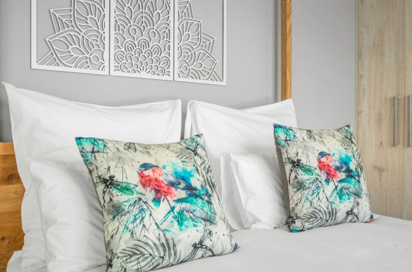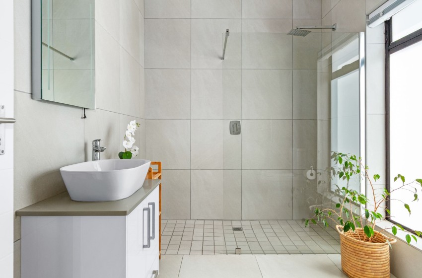The villa boasts four bedrooms, two are fitted with queen beds, while the other two bedrooms also feature queen-sized beds which provide balcony access. The main bathroom includes a bathtub, shower, his & hers basins with vanity, and a toilet. The second and third shared bathrooms both include a washbasin with vanity, a shower, and a toilet, as well as an additional guest bathroom.