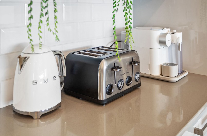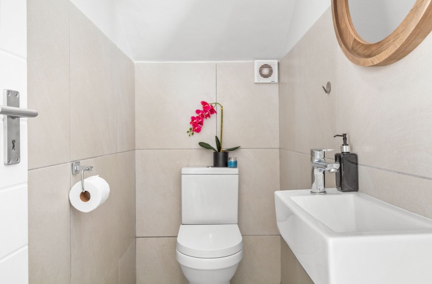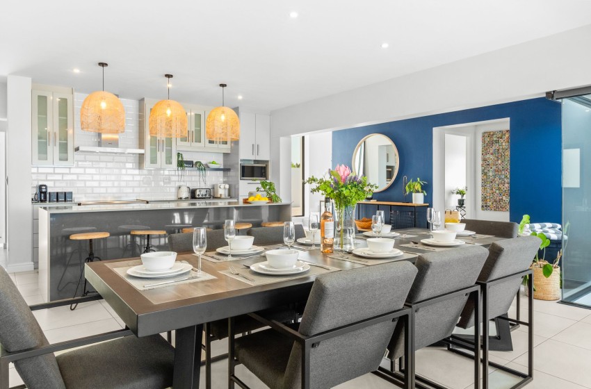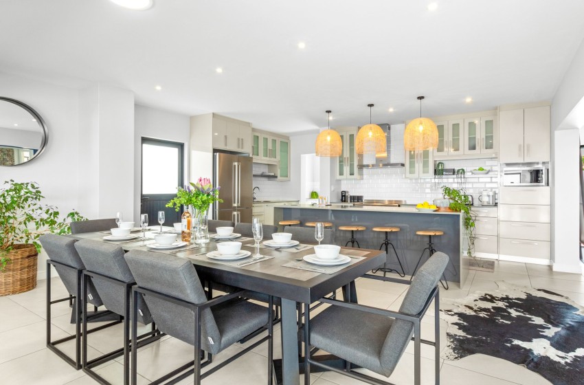 The villa features a fully equipped kitchen designed to make your stay as comfortable as possible, including a dishwasher and washing machine for added convenience. Adjacent to the kitchen, the dining area is furnished with a large dining table with seating for up to eight guests.