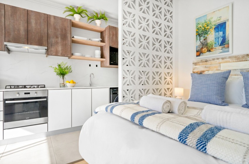 Upon entering the studio, you will be greeted by the open-plan design comfortably accommodating up to two guests. The kitchenette is equipped with everything you will need for a comfortable self-catering stay including a washing machine for added convenience.