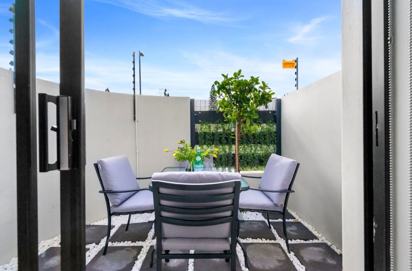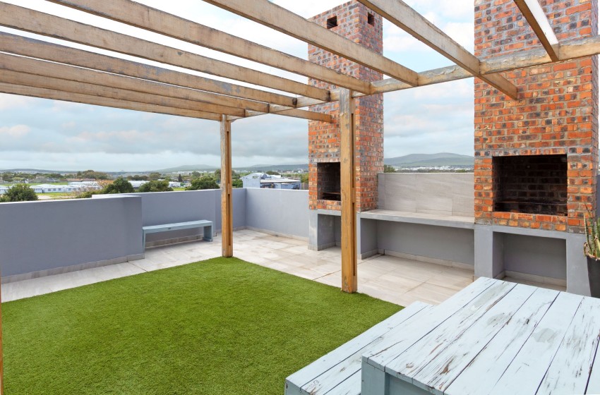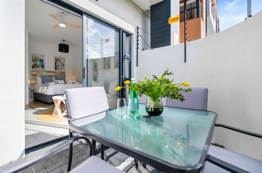 Sliding doors open to a private patio with an outdoor dining set that seats four. Additionally, the apartment is secure and includes a parking bay for one vehicle. Guests also have access to a communal rooftop braai area, perfect for enjoying outdoor meals with stunning views.
