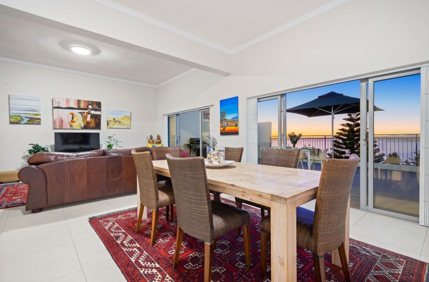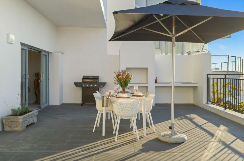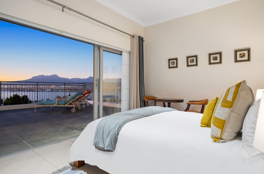 A glass sliding door leads to a spacious balcony that offers stunning views of the ocean and mountains. The balcony is equipped with an outdoor braai (barbecue), comfortable loungers, and a dining set that seats up to six people, making it the perfect place to relax and enjoy the beautiful scenery.