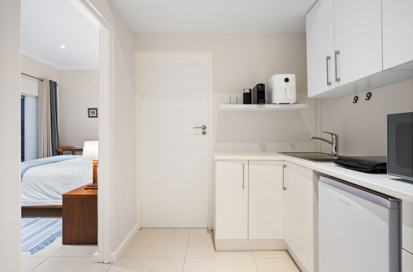 A modern kitchenette, equipped with an electric plate stove, an air fryer, a dishwasher, a microwave, a kettle, and a minibar fridge, features everything you need for a comfortable self-catering stay. A Nespresso machine with a frother is also available.