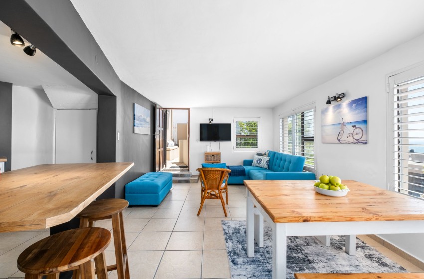 The apartment is designed with comfort and privacy in mind. While guests will share an entrance with the main house, the unit is completely secluded, ensuring a tranquil and uninterrupted stay. Inside, the open-plan living area merges seamlessly with a semi-equipped kitchen featuring a kettle, toaster, refrigerator, air-fryer and microwave, ideal for preparing light meals.
