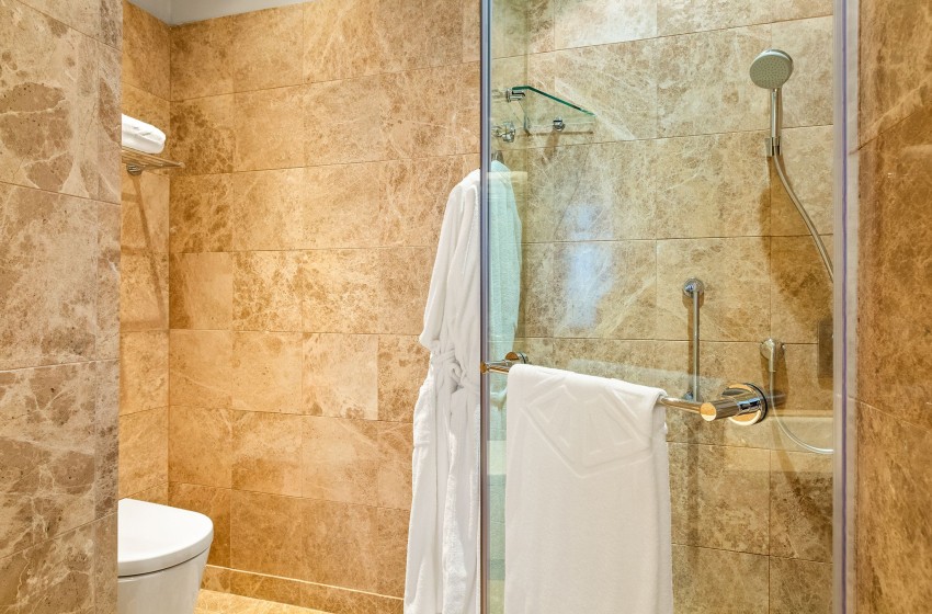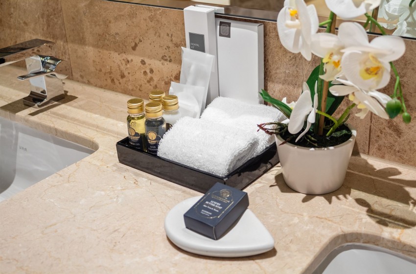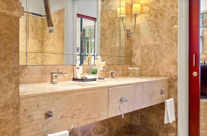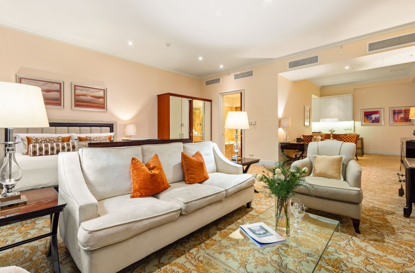 Upon entering your hotel room, you will be welcomed by a spacious and elegant atmosphere, complemented by large windows that fill the area with natural light. The open-plan design facilitates easy movement throughout the suite, which features a cozy and inviting lounge area furnished with plush seating, a flat-screen TV, and internet access.