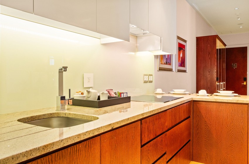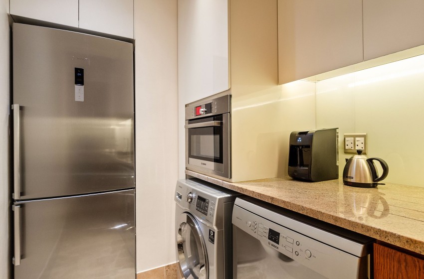 The kitchenette is equipped with essential amenities, including a fridge and washing machine. Additionally, the suite includes a dining area with a table and chairs for your convenience.