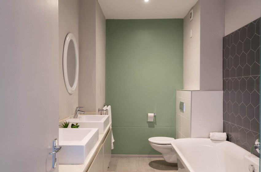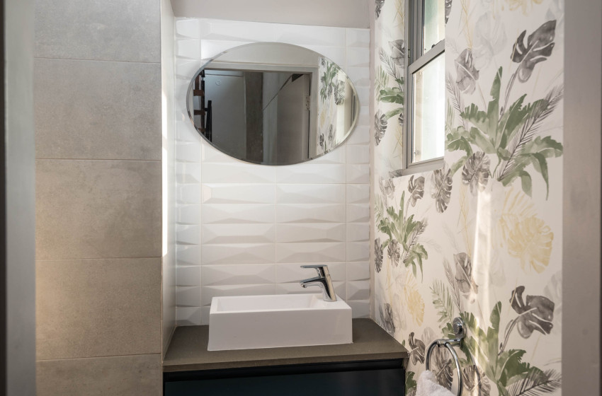 The master bedroom features a cozy queen-size bed and includes access to a shared bathroom with a soothing bathtub. Guests will love the private balcony in this loft-style space, which overlooks the dining area. Connected via a passageway, the second bedroom is beautifully decorated with elegant wallpaper and also offers a queen bed, along with its own private balcony. This room shares access to the same well-appointed bathroom, which includes a rejuvenating shower.