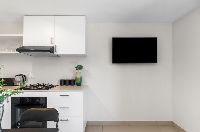 Walking into the property, you are greeted with an open-plan kitchen and lounge. The kitchen is equipped with all necessary amenities for a comfortable self-catering stay, with a washing machine for added convenience. The kitchen seamlessly flows into the lounge, creating a space that is intimate yet spacious. The lounge is bathed in natural light streaming in from the large windows. The space is stylishly furnished with a comfortable 2-seater couch, modern coffee table and a flatscreen TV. Wi-Fi is available throughout the apartment.
