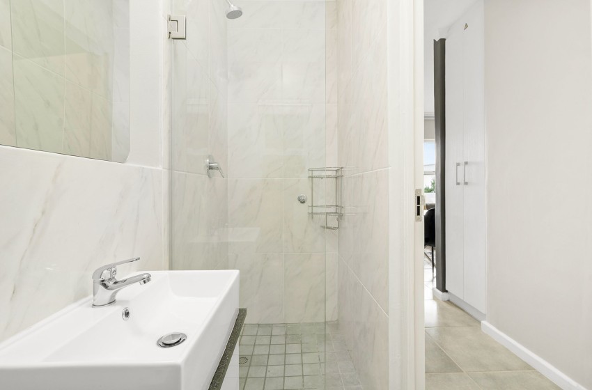 The bedroom is fitted with a comfy queen-size bed with a nightstand, large windows, and more than enough wardrobe space. The bathroom is equipped with a washbasin with vanity, a bathroom cabinet, a shower, and a toilet. Fresh linen and towels are included with your stay.