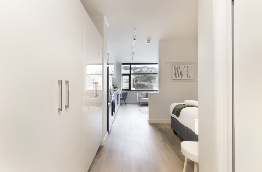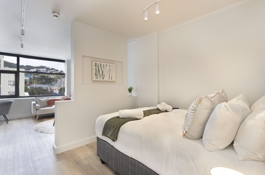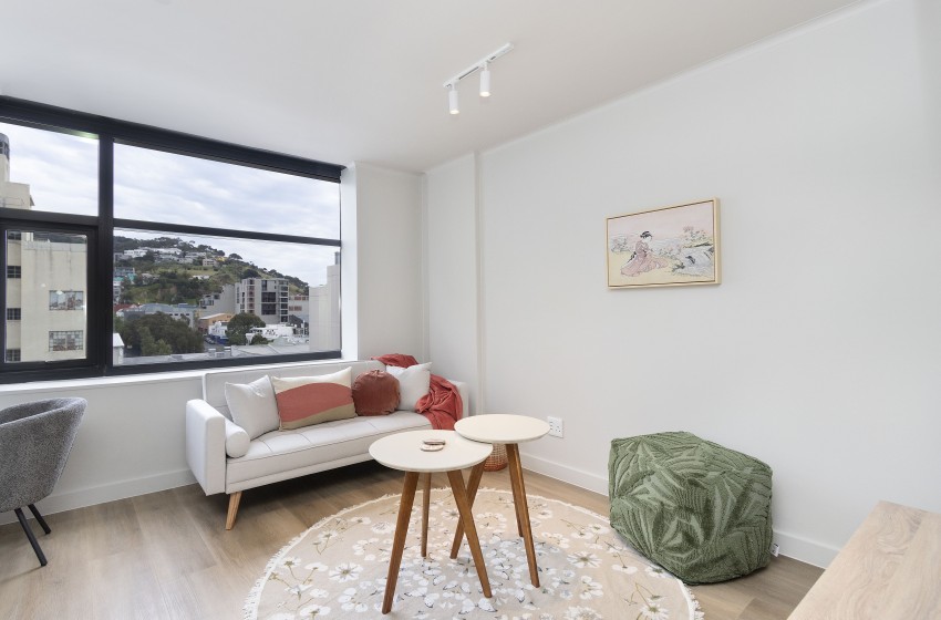 Step inside Tokyo 701 to find the perfect place to unwind after a day of touring Tokyo's bustling streets. The stylish bedroom features a comfy queen-sized bed, and a wall divides the bedroom from the living room and kitchen. A spacious living area is bathed in natural light from expansive windows that frame captivating views of Tokyo's cityscape, providing an ideal setting for curling up with a good book or simply taking in the breathtaking city views. The apartment also has a delightful, fully equipped kitchenette that caters to all of your culinary aspirations.