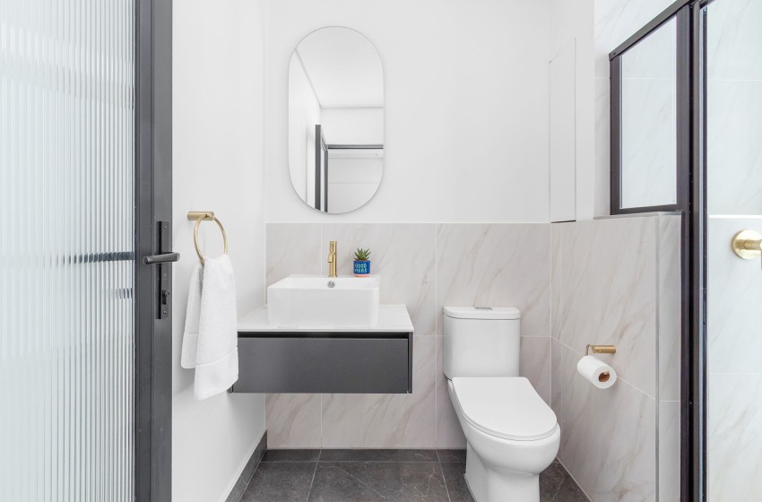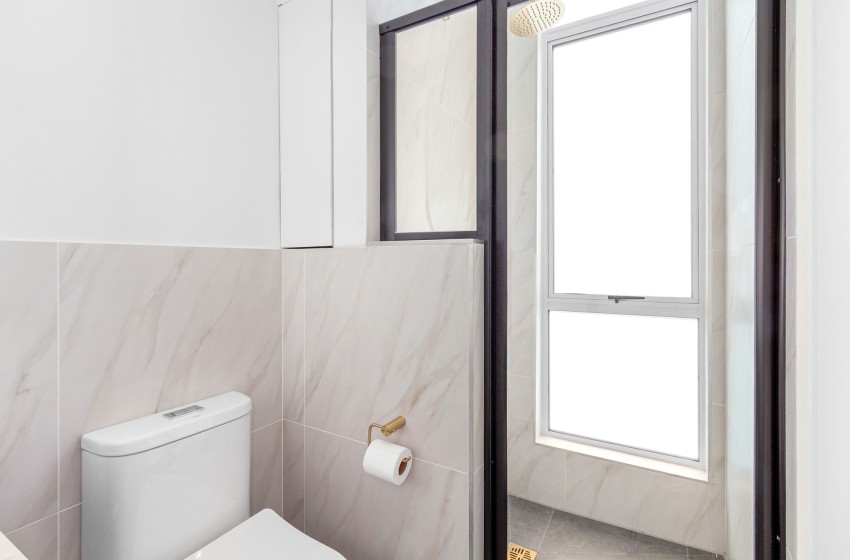 This modern apartment features an open-plan space, where the bedroom and lounge share the same inviting setting. The bedroom is fitted with a cosy queen-size bed and a wall lamp. It also features an arch-shaped window that fills the apartment with natural light and provides lovely views of the neighbourhood. The bathroom is modernly designed and well-appointed, equipped with a floating vanity with a sink, a shower, and a toilet. Linen and towels are provided with your stay.