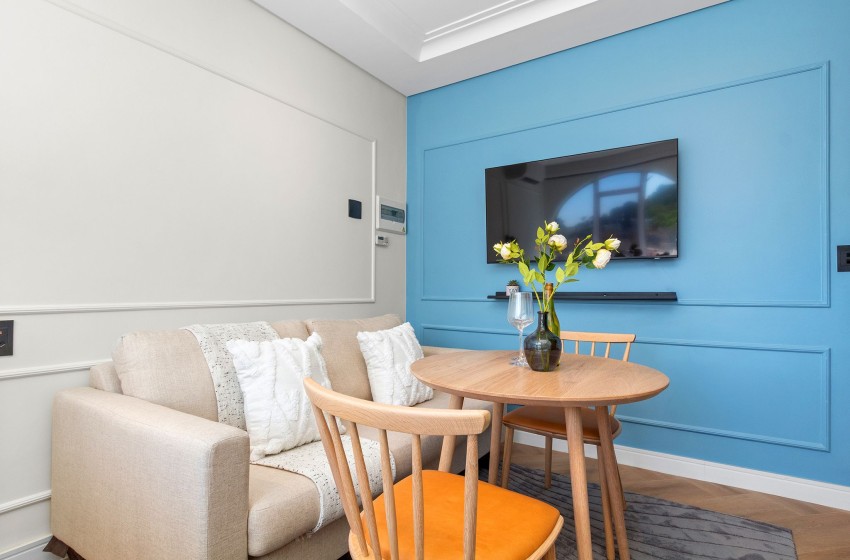The lounge area features a minimalist-inspired couch with cushions and a throw blanket added for relaxation and style, while you enjoy entertainment from a mounted flatscreen television. It also includes a compact dining space that features a table and seating for two.