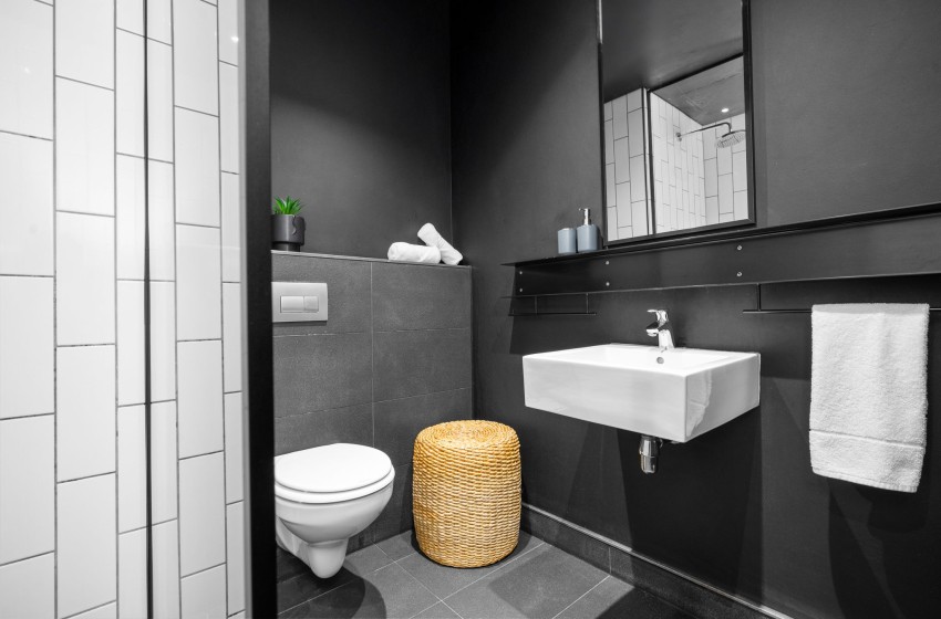 This one-bedroom flat has a glass-partitioned sleeping area with a comfortable queen-sized bed. An elegantly designed bathroom fitted with a toilet, washbasin with vanity, and a modern, walk-in shower. Fresh linen and towels are provided during your stay.