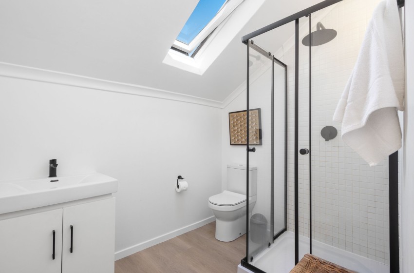 The house features four elegant bedrooms: the first is a king-size suite with an ensuite bathroom, and the second is a queen-sized bedroom with its own ensuite bathroom. The third bedroom has a double bed with an ensuite bathroom, while the fourth bedroom comes with two single beds and air conditioning, and shares a bathroom, making it perfect for families or groups. Each bathroom is designed for comfort, with one featuring a bath and the others equipped with showers.