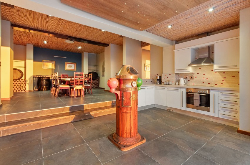 The lower level offers a second living space with its own kitchen, dining, and lounge area, along with two interleading king-size bedrooms with en-suite bathrooms and direct access to the outdoor area. Please note that this level is accessed via stairs and is therefore not wheelchair-friendly.