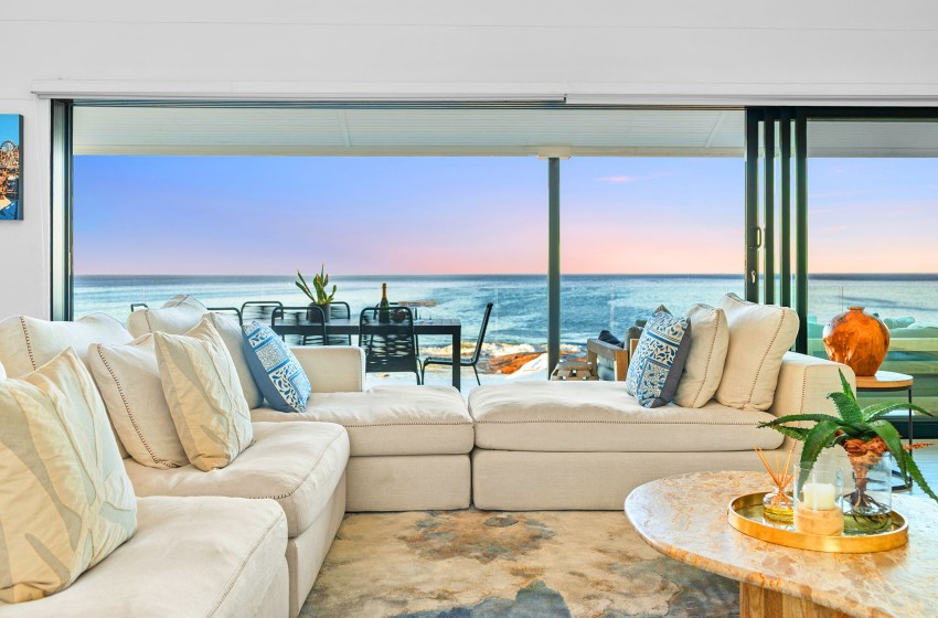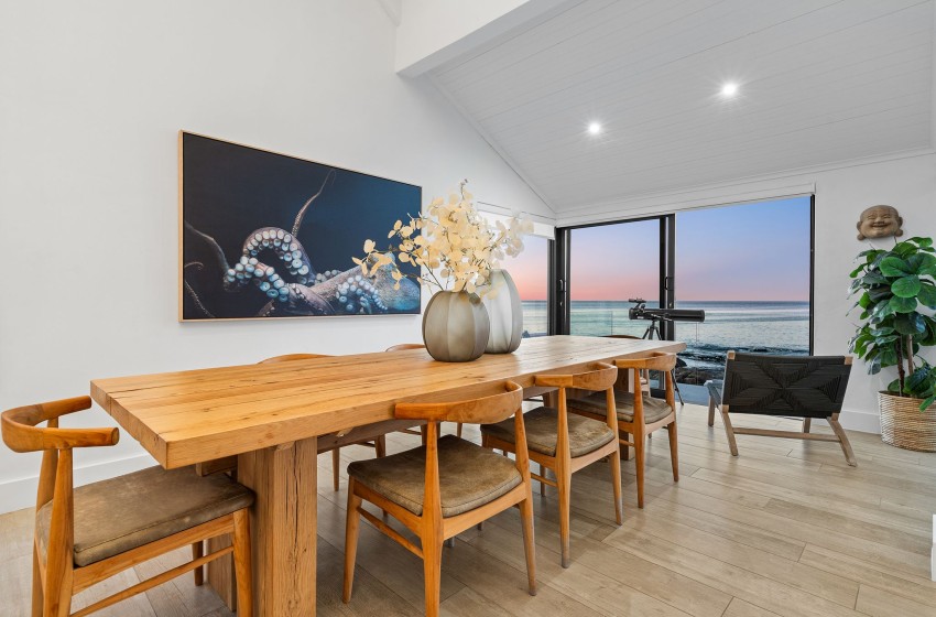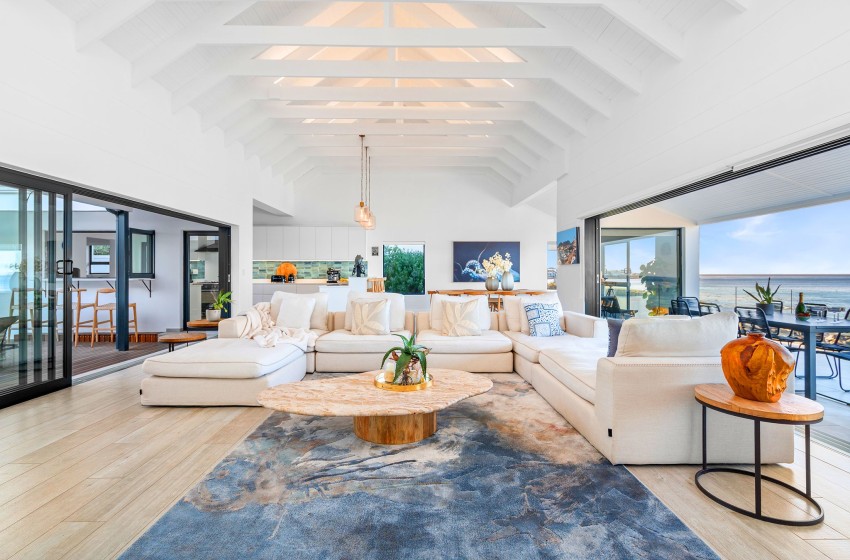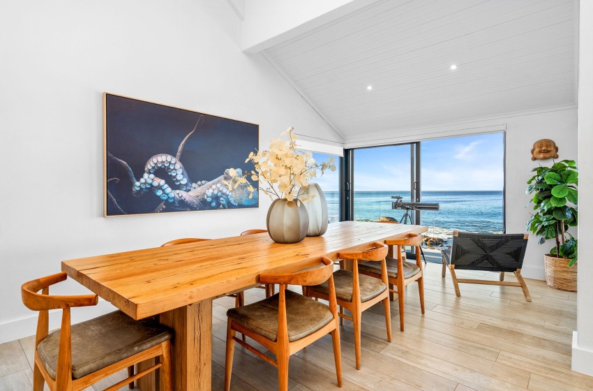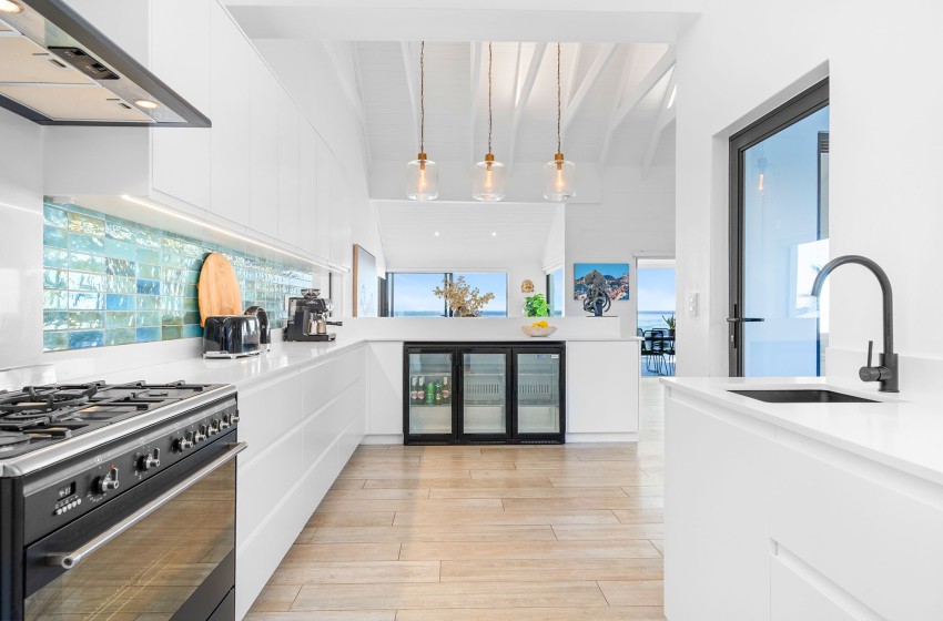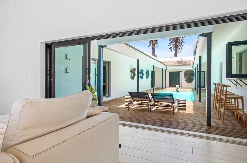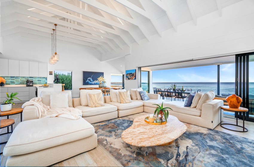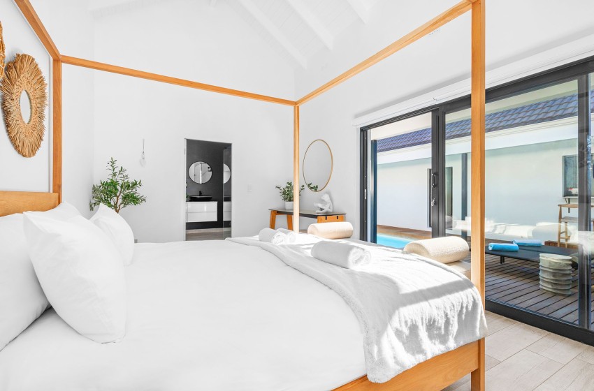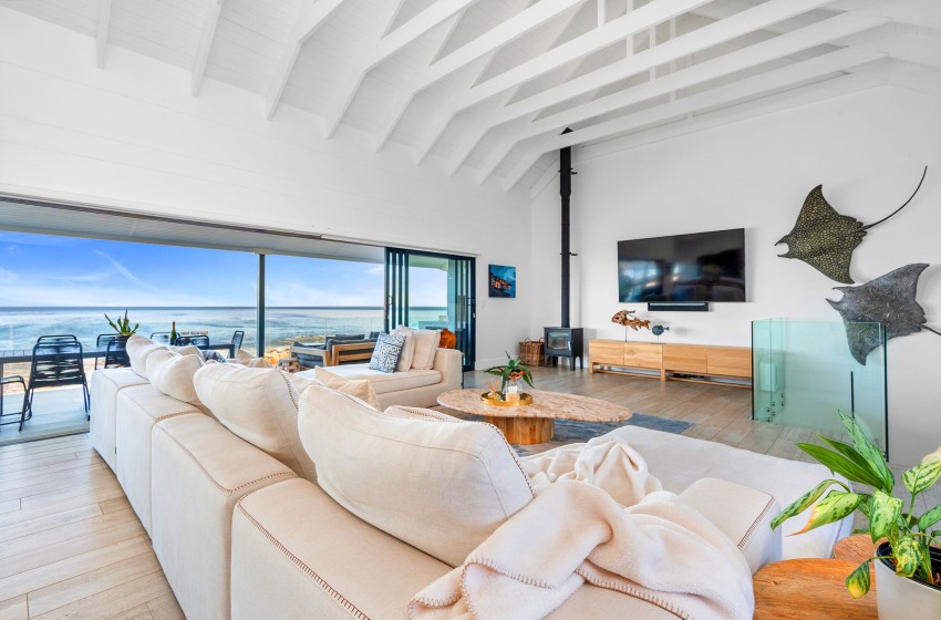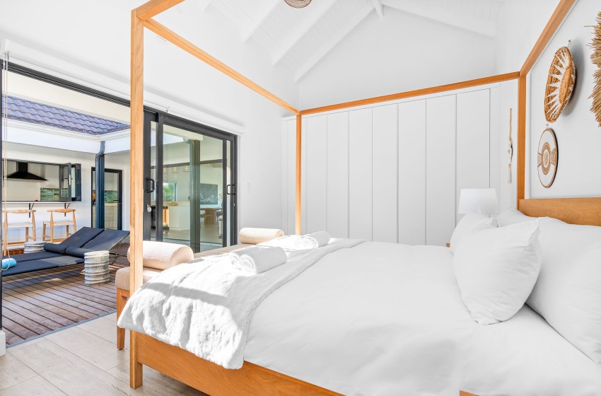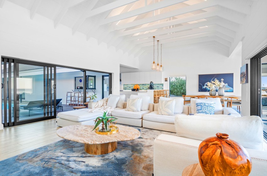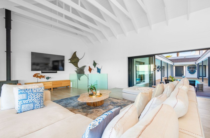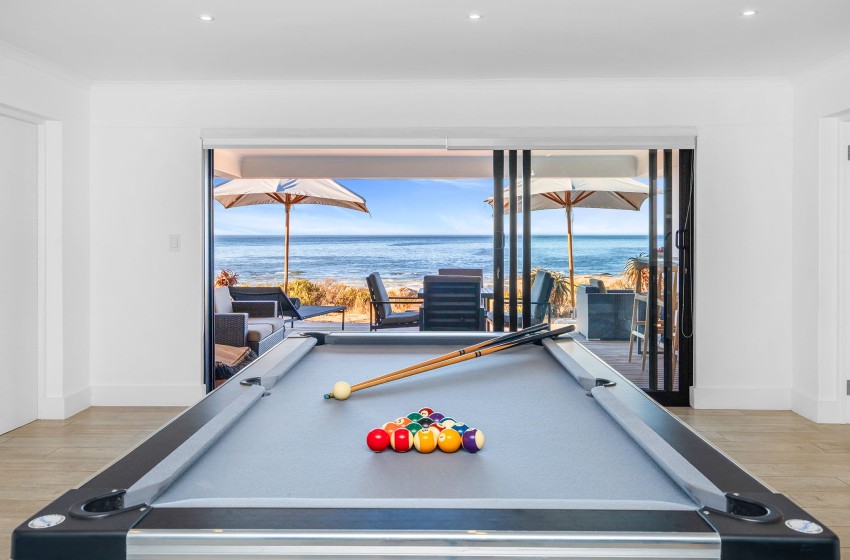 Large stackable glass doors lead guests out from the living area onto a magnificent patio boasting spectacular ocean views featuring an outdoor fireplace, comfortable outdoor furniture and a dining table with chairs seating eight guests. Upstairs living areas open to balconies with glass balustrade and sea-facing outlooks. This is the perfect spot for entertaining or just relaxing while taking in your surroundings. For added entertainment, guests can make use of the pool table and lounge area on the lower level of the house, or make their way down to the beautiful sandy beaches via a private walkway directly from the villa. After a refreshing swim, rinse off the sand and salt under the convenient outdoor shower by the beach before heading back inside to relax.