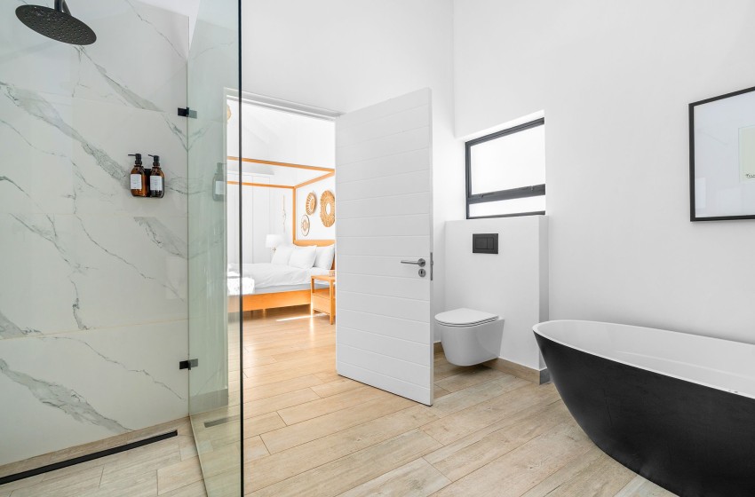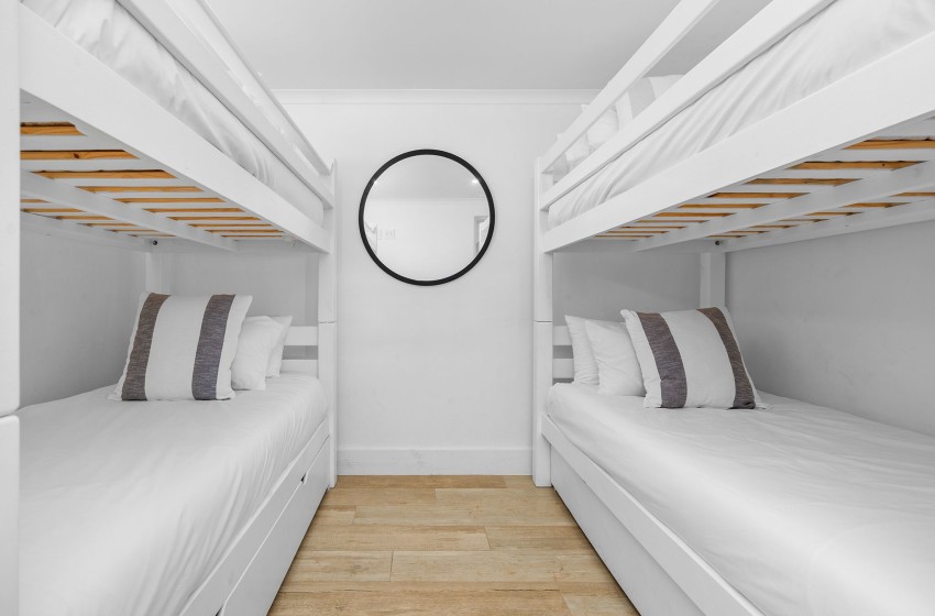 The Villa boasts six beautifully appointed bedrooms with three of the bedrooms surrounding the pool while the other three bedrooms are downstairs. The upstairs bedrooms are all pool facing with access to the pool deck through glass sliding doors, they all have king size beds and en-suite bathrooms featuring a bath, shower, toilet and basin in each en-suite and an additional guest bathroom with a toilet and shower alongside the pool area. The downstairs bedrooms offer two bedrooms with queen size beds and en-suite bathrooms including a bath, shower, toilet and basin in each as well as access to the outside deck area while the third bedroom features two sets of bunk beds making 4 single beds available in this room.