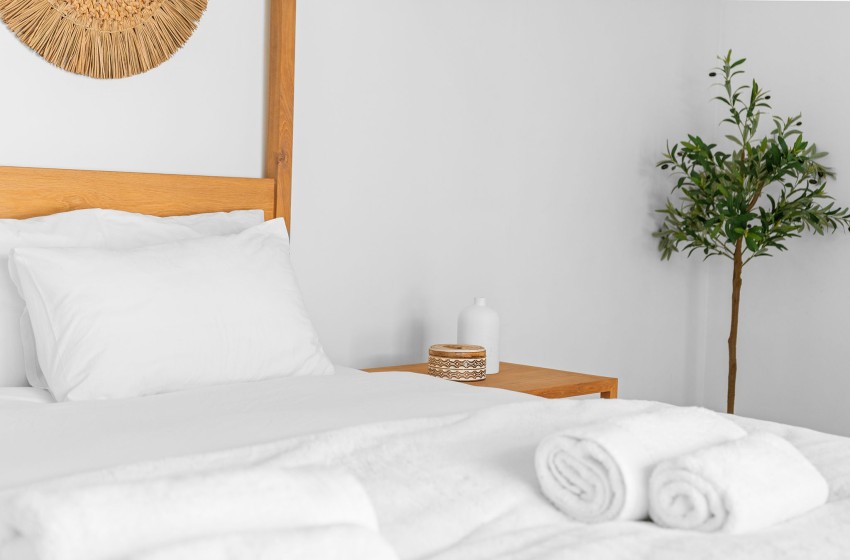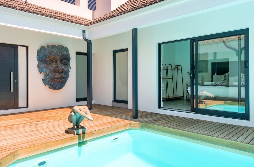 Enter the property and be greeted by a large majestic swimming pool where guests can enjoy cooling off on hot summer days, soaking up some sun on the sun loungers or sipping some cocktails at the seated area alongside the pool. From the pool deck, step in to beautifully designed open plan living space, exuding modern decor and elegance. High rise ceilings with exposed beams create a more spacious environment with large glass windows and doors surrounding the vicinity, allowing for an abundance of natural light to flood the space. The sizeable kitchen with counter side seating is fully equipped with everything you need for a comfortable self catering stay ensuring all your favourite food and drinks are prepared in style. For added convenience there is a dishwasher and washing machine in the scullery area of the kitchen. The kitchen overlooks an intimate dining area, seating up to eight guests at a large wooden dining table and the cozy lounge area with a plush U-shaped sofa and mounted flat screen TV makes the ideal place to get comfortable and unwind.