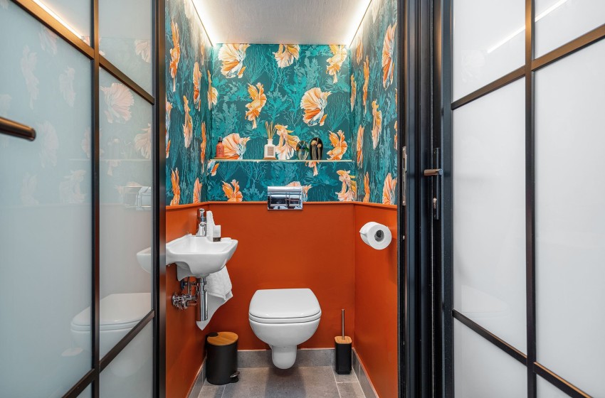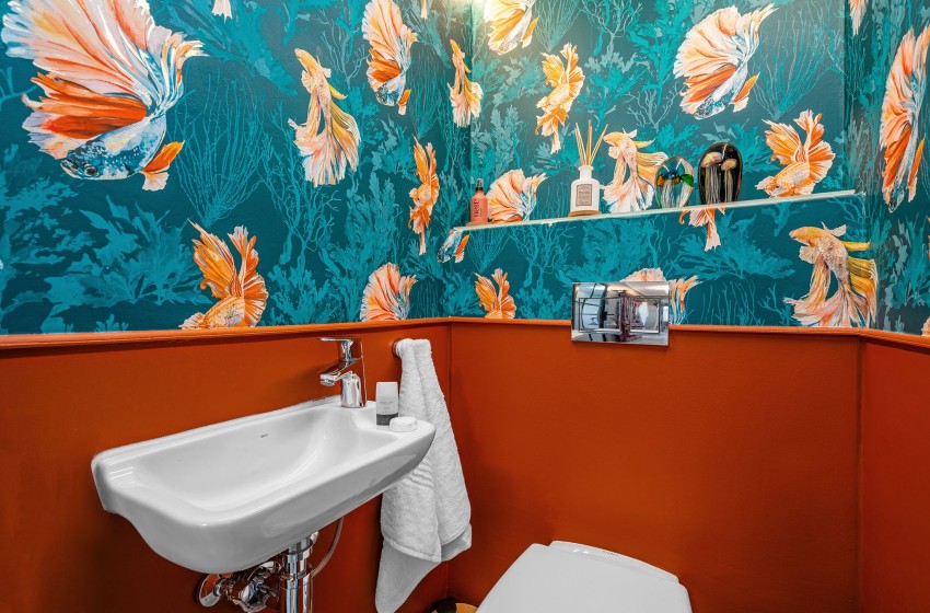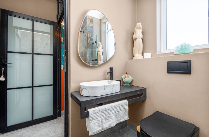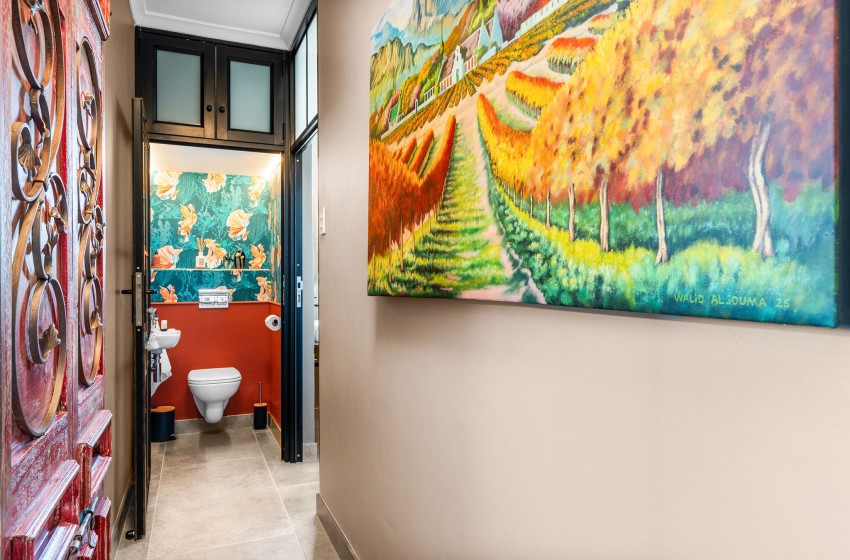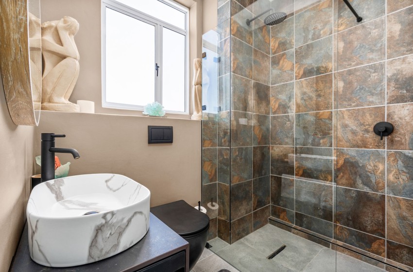 The apartment offers guests two tastefully decorated bedrooms, each with built-in cupboards. The large master bedroom with a king-size bed features nightstands with lamps and a cosy couch styled with colourful cushions, perfectly suited for curling up with a good book. The second bedroom is fitted with two single beds and boasts a sea view through the window. There is also one full bathroom with a shower, washbasin, and toilet, as well as an extra guest toilet.