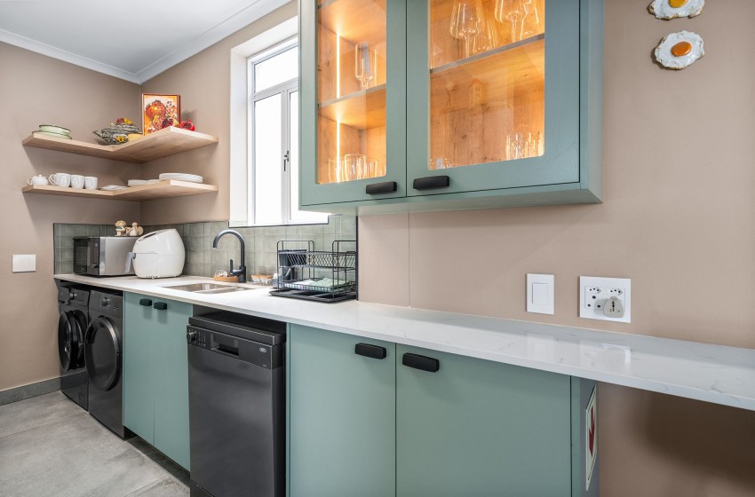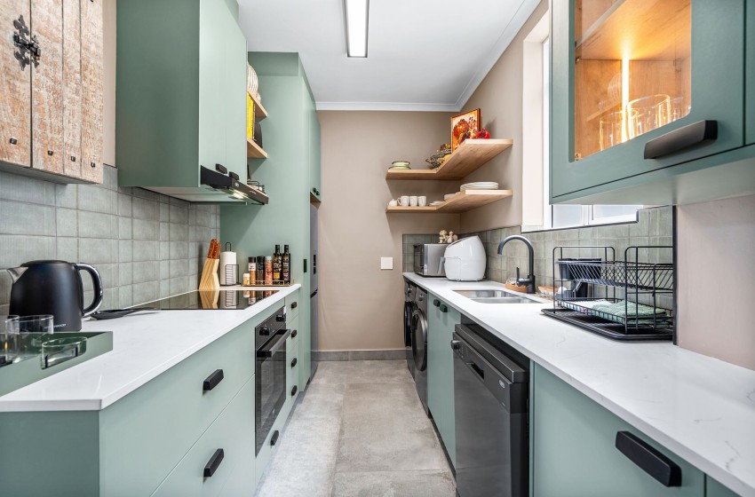 The fully equipped kitchen features a built-in electric hob, under-counter oven, dishwasher, and washing machine, which makes Waves & Wildflowers the perfect choice for guests who want the convenience of home-cooked meals and a comfortable stay during the holidays.