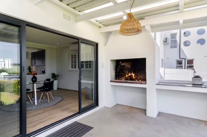 Out front of the home, a spacious patio can be found. With ample seating provided, guests can enjoy a meal or relax on the patio chairs, facing the sizeable front yard and overlooking the breathtaking scenery. The patio also features a built-in braai, perfect for social gatherings and entertaining. The property additionally provides secure parking for added peace of mind.