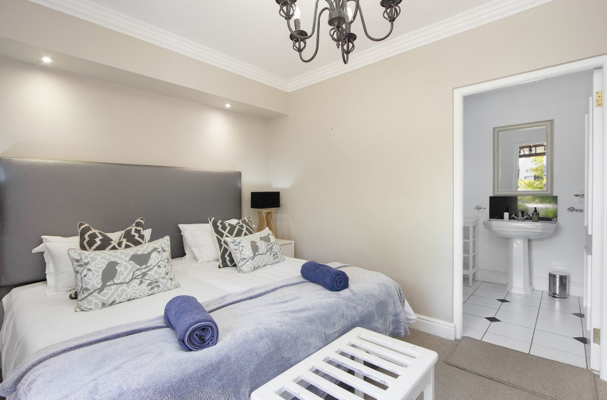 All 3 of the stylish bedrooms comprise of two single beds pushed together, with rooms 1 and 2, housing a shower and bath en-suite with the third room housing an en-suite with a shower. There is a lovely patio area with built-in braai facilities on the premises, overlooking the communal pool area; providing the perfect solution to an evening braai in a gorgeous outdoor setting. All guests have access to the communal pool area, which boasts a large swimming pool and a separate toddler pool.