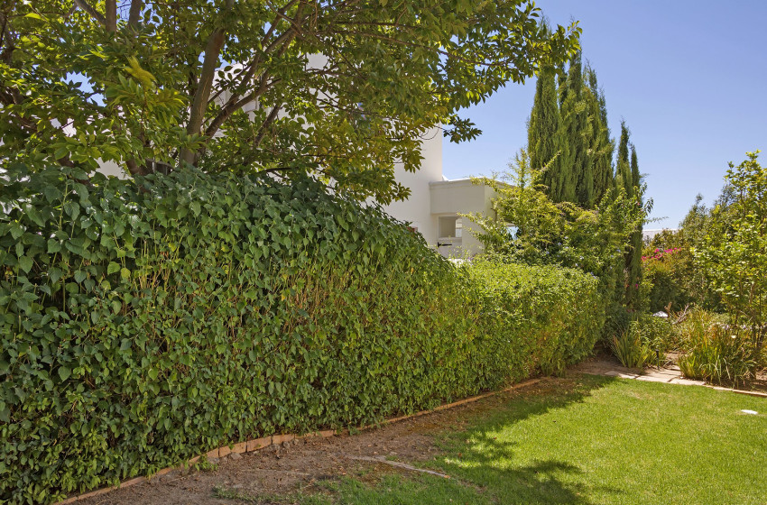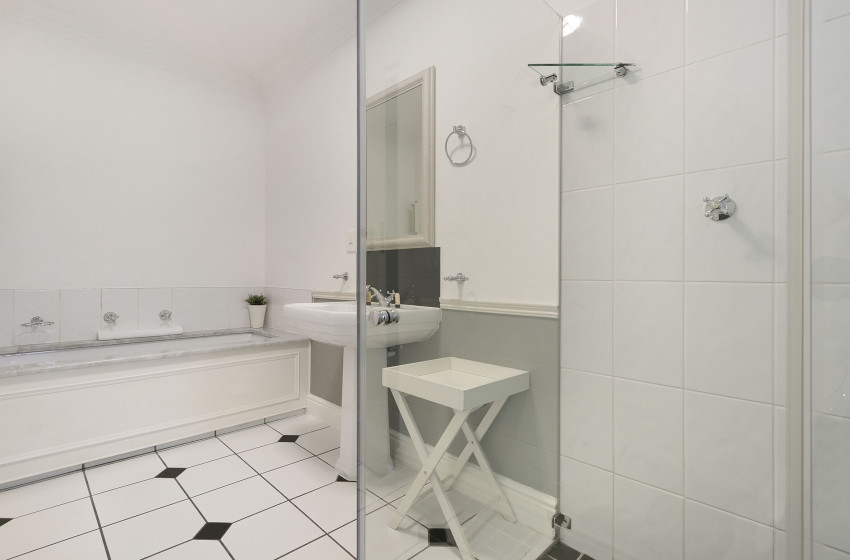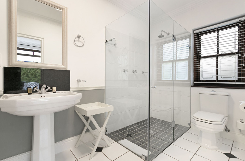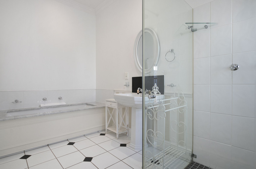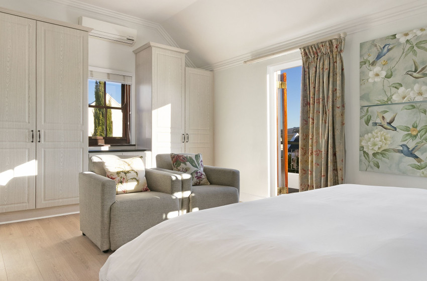 Each of the three bedrooms is beautifully styled to reflect the charm and tranquility of De Zalze Winelands Golf Lodges. The master bedroom has a king bed, two comfortable armchairs, and a spacious en-suite bathroom featuring a shower and bathtub. The remaining two bedrooms (one with garden access and the other with a balcony) each have 2 single beds and en-suite bathrooms, granting each guest the convenience of a private bathroom.