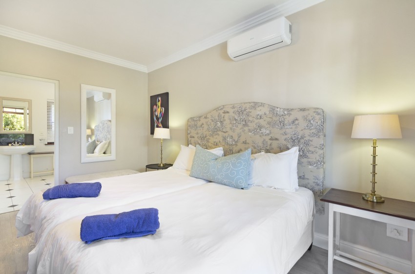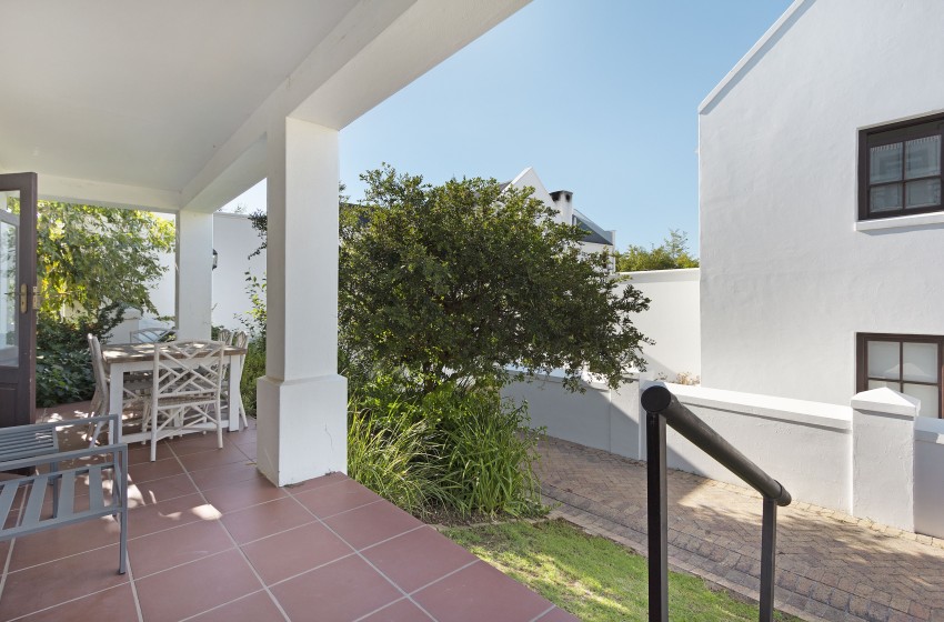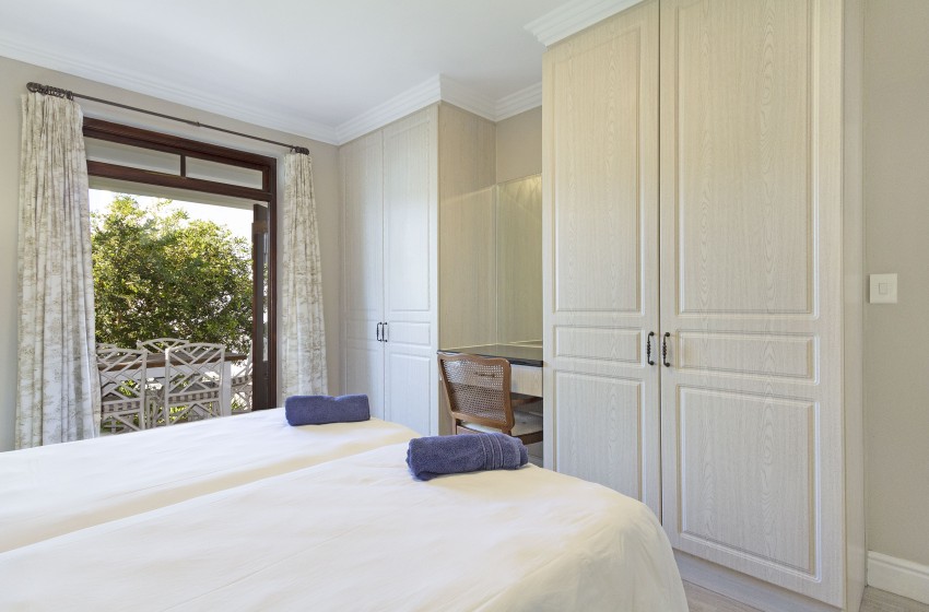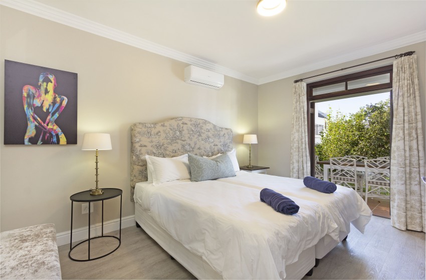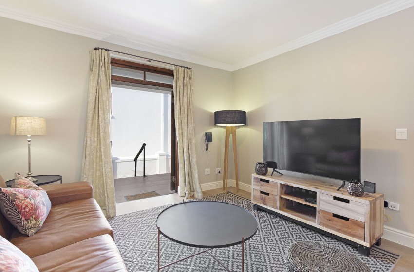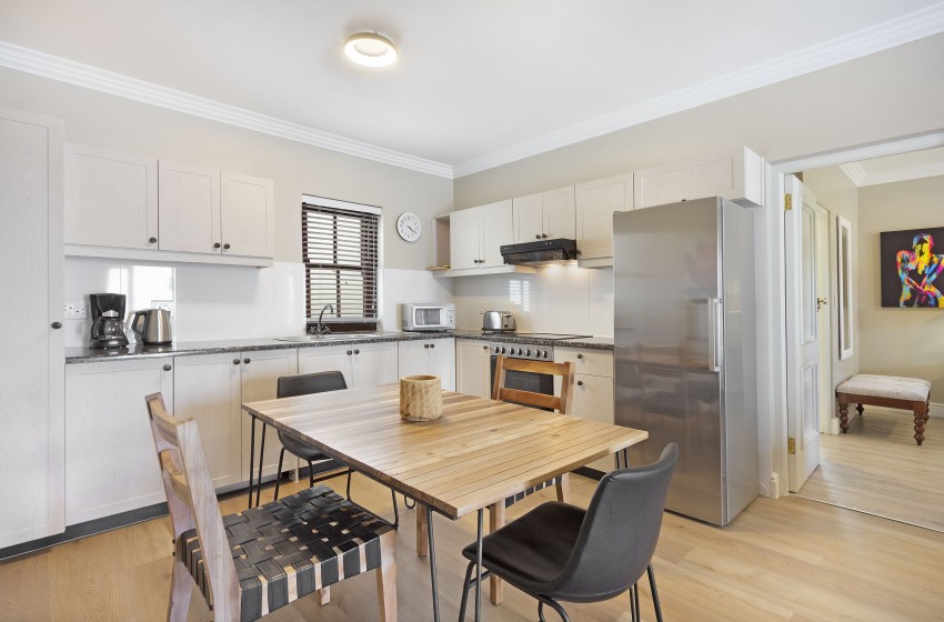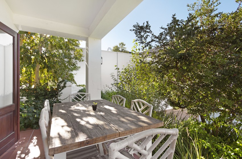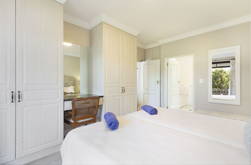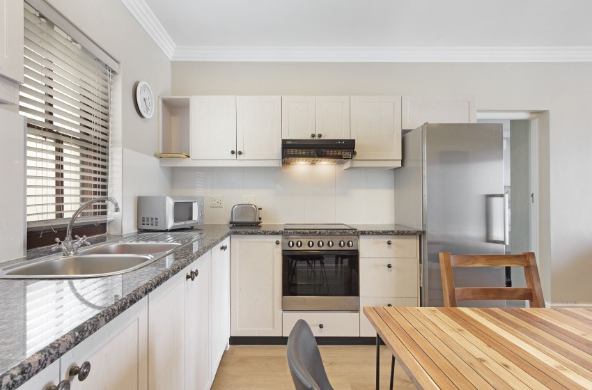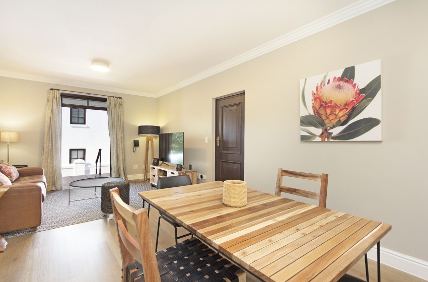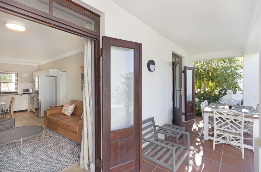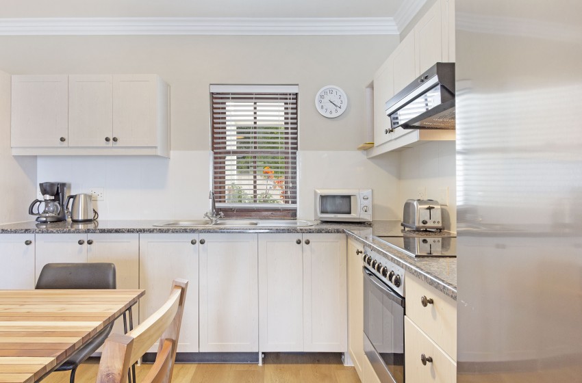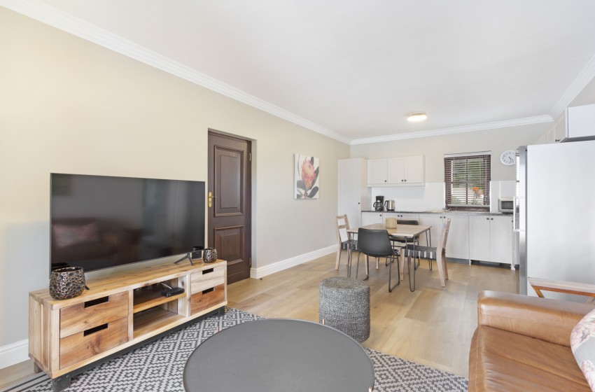 This one-bedroom apartment provides its guests with a cozy atmosphere consisting of an open-plan lounge, dining area, and kitchen, opening up to a large patio where you can enjoy a braai on the gas braai. The kitchen is fully equipped for your self-catering needs and provided with a dining table that can comfortably seat two guests. The lounge comes furnished with a smart TV, with access to WIFI and DSTV where you can enjoy a cozy night at home with your loved ones. The bedroom carries two three-quarter beds, which can be combined to create a queen-sized bed—there is also a sliding door that opens up to a small garden. If the weather allows, a communal pool area is available to all guests staying within the estate.