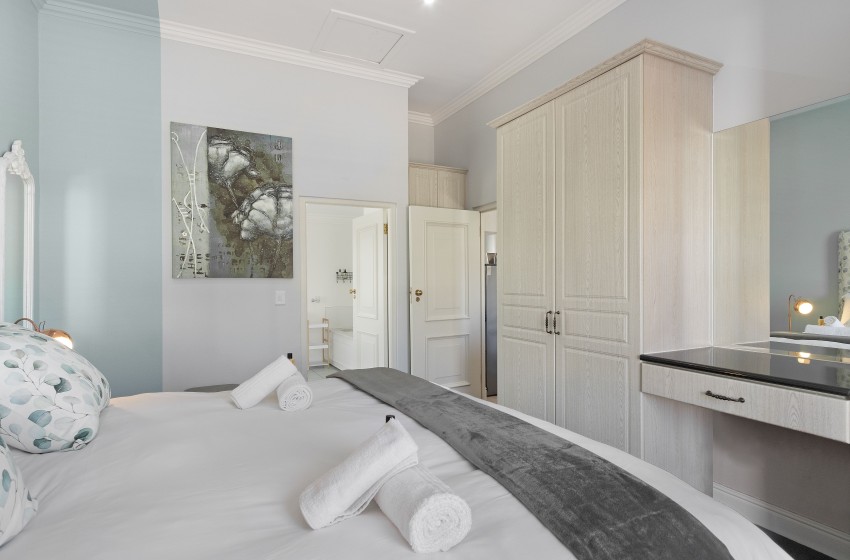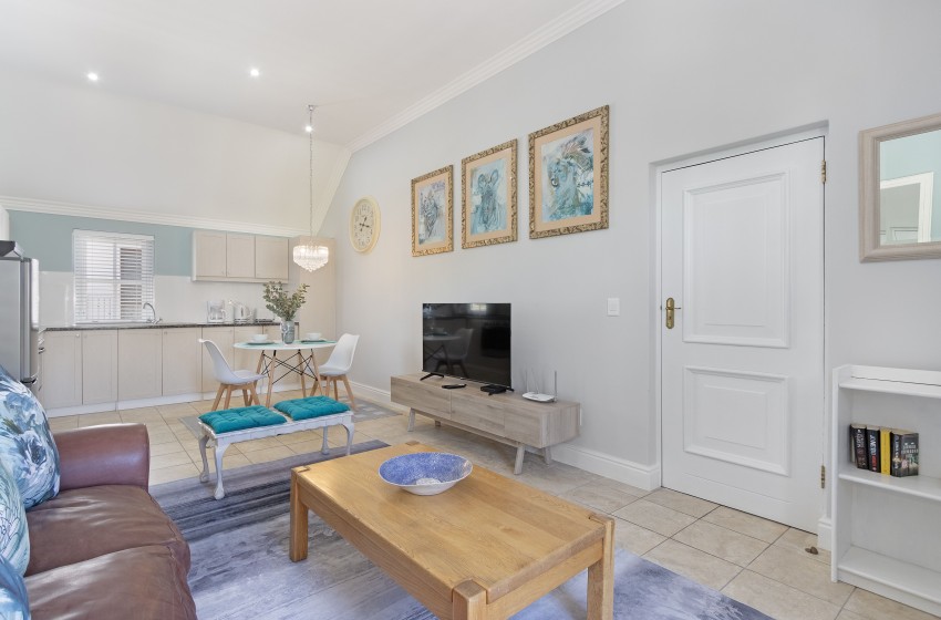 This single-bedroom holiday apartment is sleek and stylish. The kitchen area comes kitted with all the essential appliances, cupboard storage, and working space; ensuring a comfortable stay from the moment you step foot inside. The kitchen leads into the open-plan dining/living area, with a dining suite accommodating up to four guests. The living area is roomy with an assortment of classy furniture, décor, and a flat-screen TV with access to DSTV services. The luscious balcony area hosts an outdoor dining suite, where the sunset can be enjoyed over a good bottle of wine.