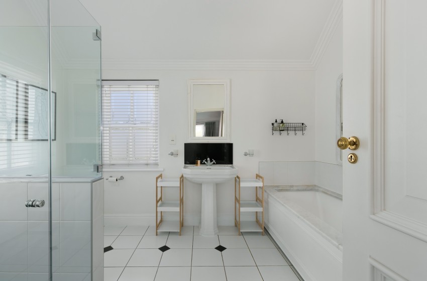 The bedroom area is modern and cosy and receives ample amounts of natural light, while being provided with air conditioning facilities to dial in your perfect climate. The bedroom provides you with access to the beautiful, en-suite bathroom – housing a bath, shower, toilet and vanity.